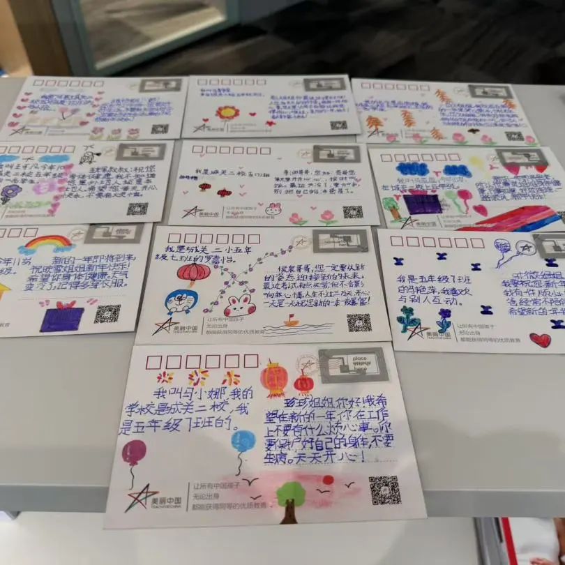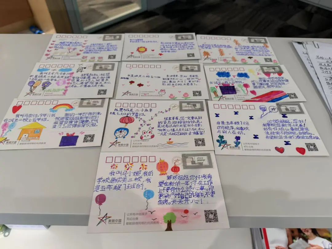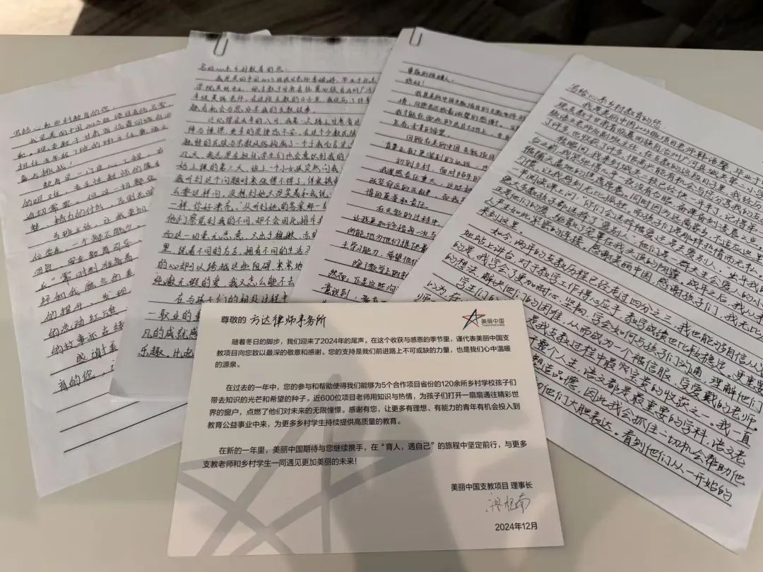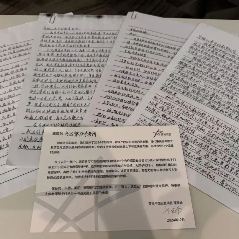 在2024年的最后一天,我们还收到了今年4月与“美丽中国支教项目”(请点击蓝字跳转阅读)携手进行支教访校之旅中结识的小朋友们的新年贺卡。孩子们真挚、可爱的祝福,以及一个个略带稚气的问题:“您为什么选择做律师?”“如果没有法律会怎么样?”“你们的城市大吗?”都带着这个时代罕见的真诚,很难不让人深受触动。
