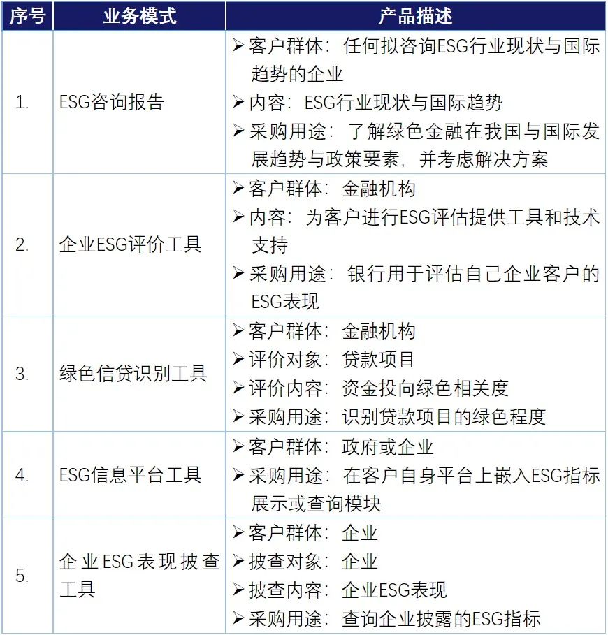 此外,部分机构亦开展向金融机构或政府机关等第三方提供用于公司ESG评价的标准化或定制化模型等工具的服务,以满足金融机构进行绿色信贷识别等与绿色金融相关的第三方需求。