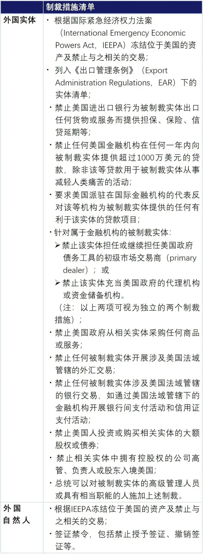 针对被列入商业秘密制裁清单的外国实体,PAIPA共提供了13项可供总统候选的制裁措施,其中总统必须选择至少五项制裁措施(豁免除外);针对外国实体的董事、高管等个人,PAIPA提供并要求总统实施2项候选制裁措施(豁免除外)。
