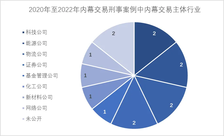 • 内幕交易主体所涉行业:科技公司2起,能源公司2起,物流公司2起,证券公司2起、基金管理公司1起,化工公司1起,新材料公司1起,网络公司1起,未公开2起。