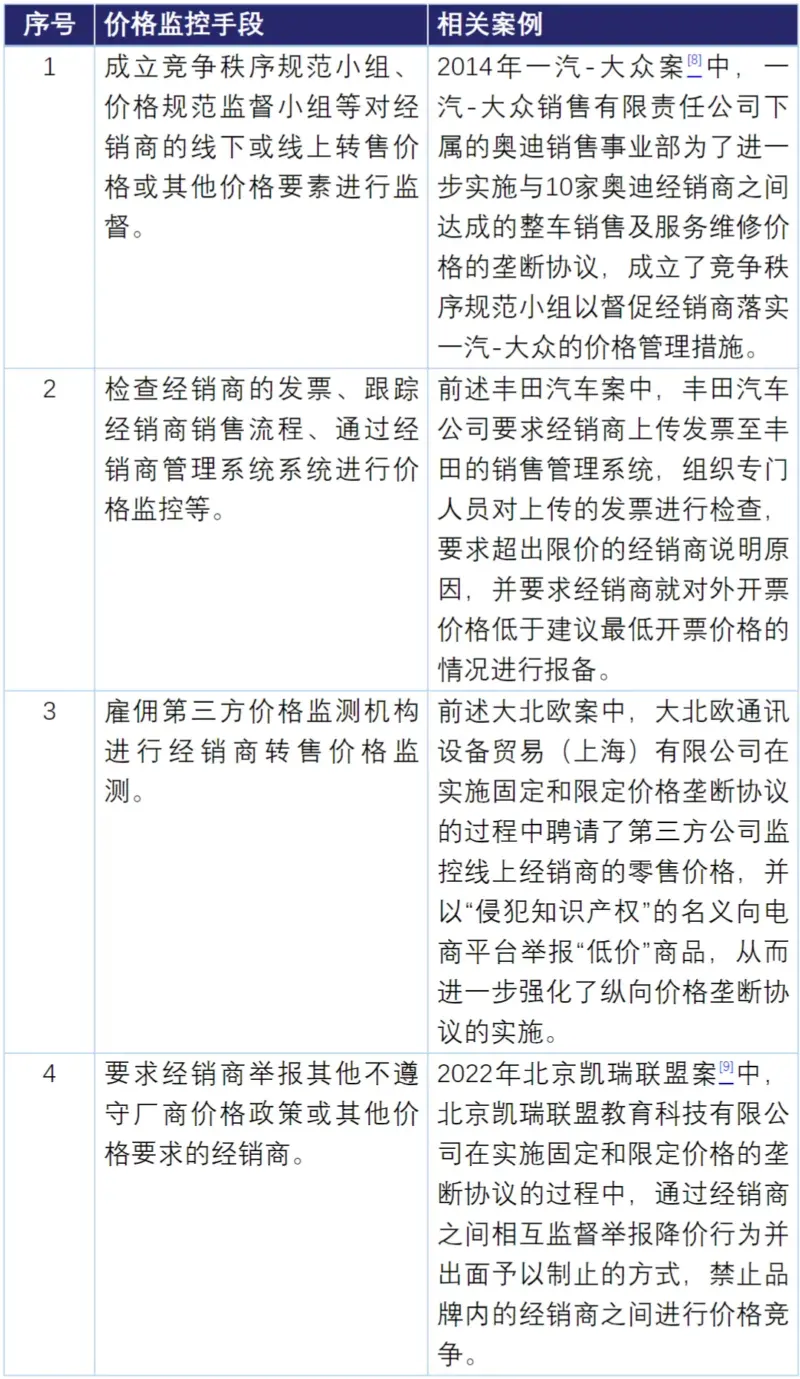为监督经销商执行供应商的价格要求,供应商通常还会辅以多种形式的价格监控手段,这些手段在反垄断执法机构进行调查和处罚时往往会被认定为加重情节。例如: