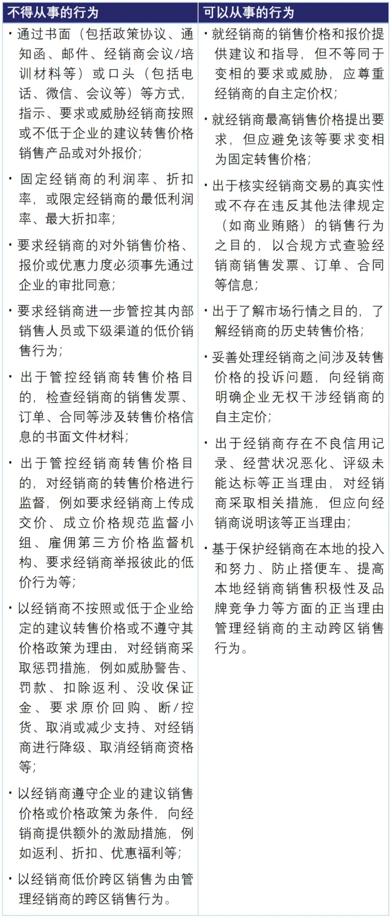 • 对于不能适用安全港制度的企业,应避免转售价格维持行为,且不能将纵向非价格限制作为转售价格维持的辅助或实施手段。针对很多企业普遍采用的跨区/跨客户/跨渠道销售管理制度,企业需要注意,在经销商政策和实操层面,都不能以管控经销商低价销售为目的,进行跨区/跨客户/跨渠道销售限制。建议企业在实操过程中对相关业务人员进行反垄断合规意识的培训,严格禁止业务人员在经销商管理政策或对经销商的日常管理、沟通过程中,将限制经销商跨区/跨客户/跨渠道销售作为管控经销商转售价格的一个手段。