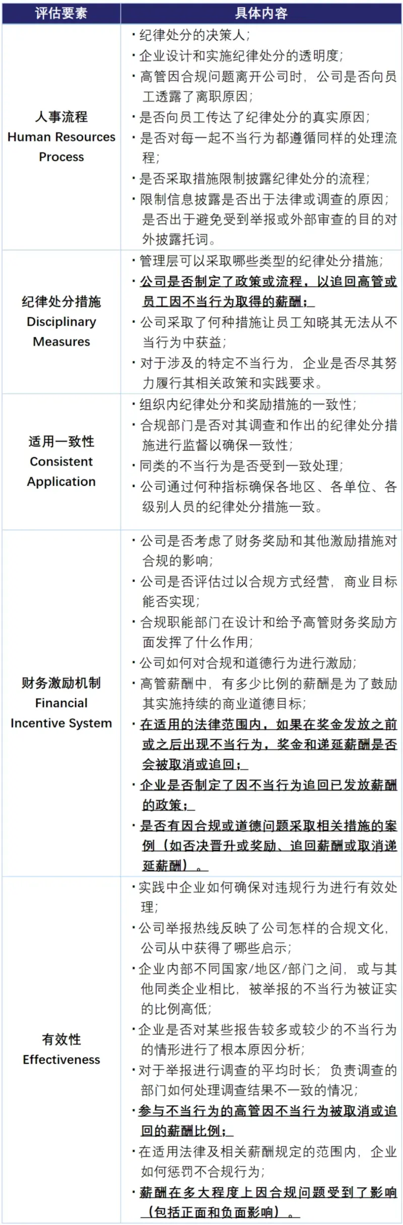 根据该节规定,检察官将从以下方面评估企业薪酬机制是否完善:(1)是否在薪酬制度中规定了延迟发放与合规相挂钩的某些薪酬类型,以激励员工合规;(2)是否在与员工签订的合同中设置了相关条款,约定如发现员工参与了不当行为或应对不当行为负责时,则企业有权追回已发放的薪酬;(3)是否依照适用的法规和内部制度实际执行了追回或降低薪酬的规定。