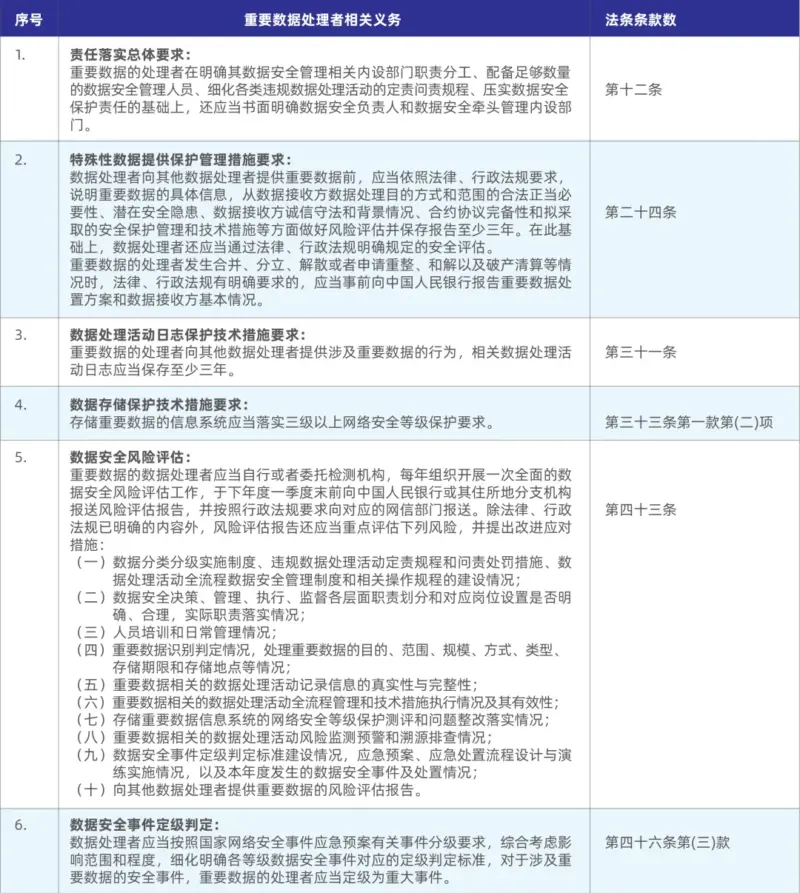 对于“重要数据应当境内存储”、“规定情形下申报数据出境安全评估”等均为已出台上位法所明确法定义务的条款,《征求意见稿》没有再次重申,未额外增加合规要求,但是提出了如下的重要数据处理者的相关义务。目前《征求意见稿》尚未对重要数据的范围、识别、举例作出具体规定。(以下图表内容来自对《中国人民银行业务领域数据安全管理办法(征求意见稿)》原文的整理编辑,点击图片可放大查阅)