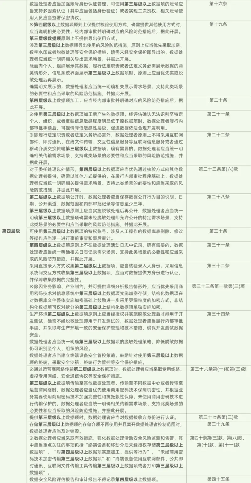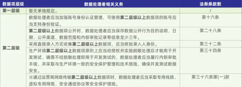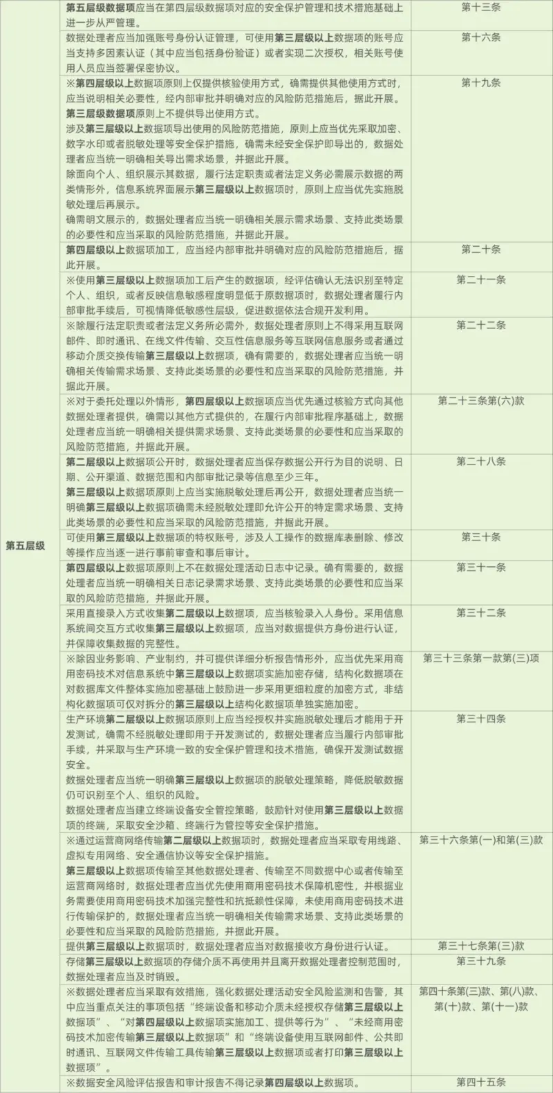 针对不同层级的数据项,《征求意见稿》也规定了数据处理者应当履行的义务。需要注意,《征求意见稿》中的“以上”均含本级,以适用于“第二层级以上”数据项的义务为例,该等义务不仅适用于第二层级数据项本身,还适用于第三、四和五层级数据项,除非《征求意见稿》中对于第三、四和五层级数据项的该等义务规定了更严格的具体要求。