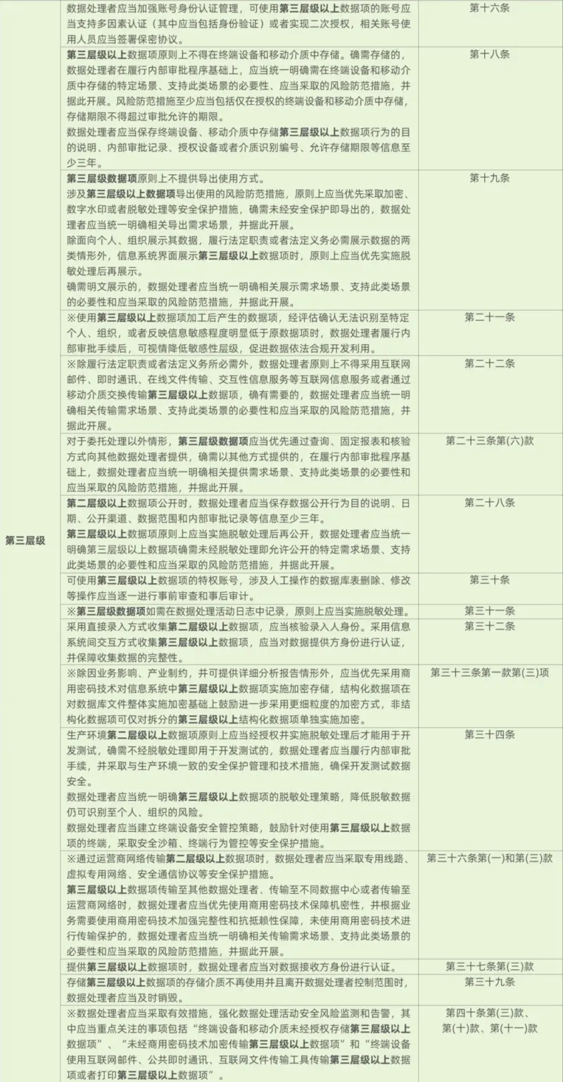 建议重点关注※标识的义务;这些规定可能在现已有规定基础上,提出更严格的合规要求。(以下图表内容来自对《中国人民银行业务领域数据安全管理办法(征求意见稿)》原文的整理编辑,点击图片可放大查阅)