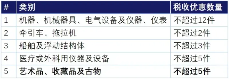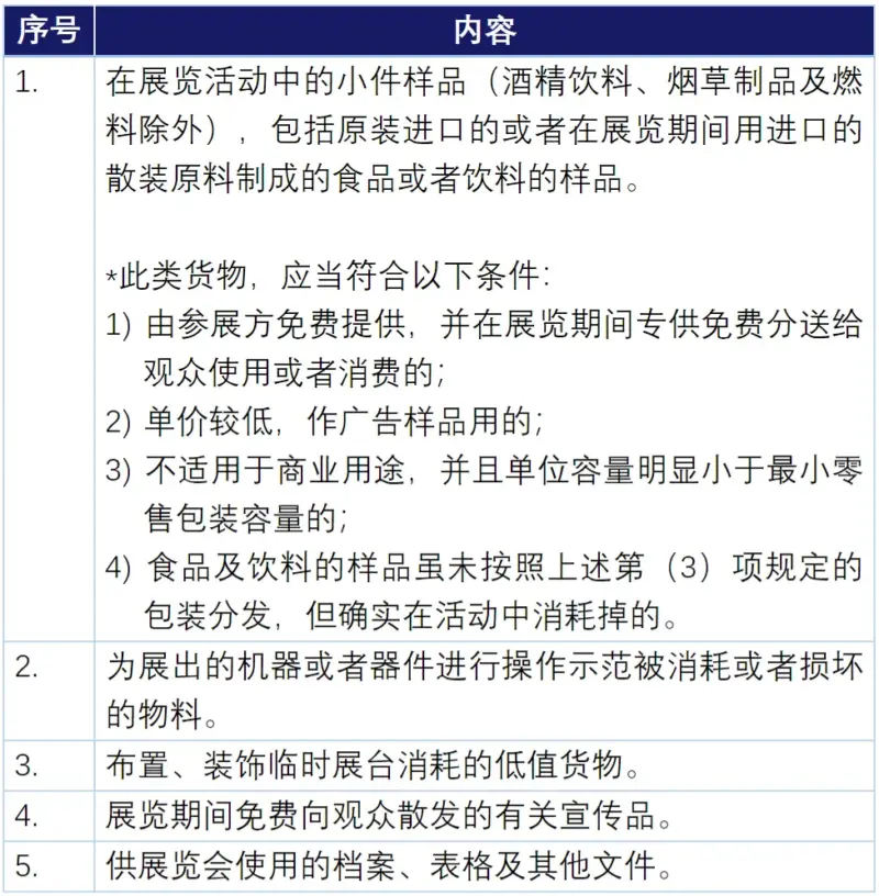 对于以下特殊类别,每个参展商在下表中所列数量限额内可以享受免税优惠。免税产品不包括国家禁止进口商品,濒危动植物及其产品,烟、酒、汽车以及列入《进口不予免税的重大技术装备和产品目录》的商品。[4]