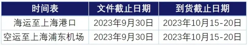 本届进博会国际运输的时间表如下,其中,冷藏冷冻品、生鲜品和易腐品等特殊展品的到货时间还应尽早与主场运输服务商联系确认。
