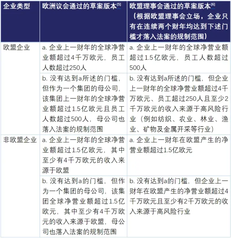 尽管上述理念已在欧洲议会及欧盟理事会之间达成共识,两机构对“大型企业”的门槛存在较大争议。与欧盟理事会通过的草案版本相比,欧洲议会进一步扩大了法案的规制范围:一方面,对于营业规模较大的企业,在营业额及员工人数门槛上,欧洲议会的要求相对更低;另一方面,对于营业规模相对较小的企业,欧洲议会取消了“高风险行业”的限制。换言之,任何行业只要达到营业额及员工人数的门槛,都将落入法案的规制范围。两机构关于适用范围的具体内容请见下表,最终标准仍待确定。