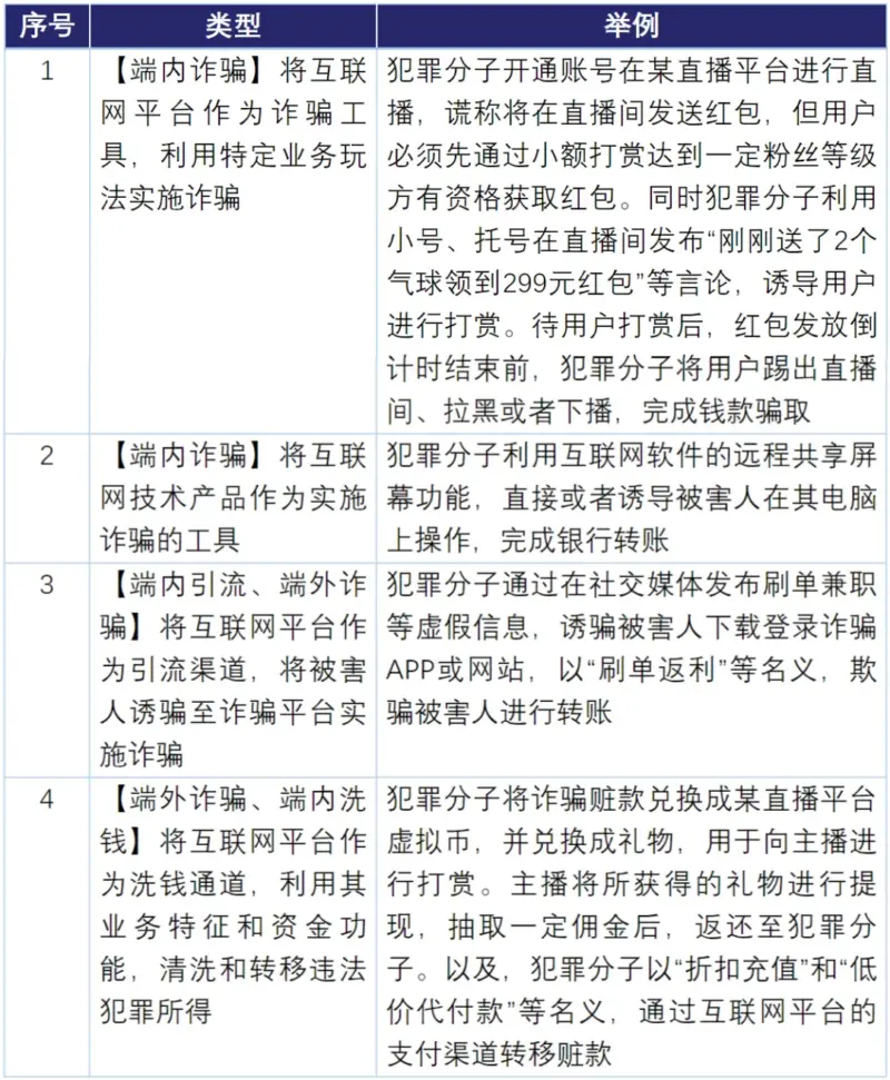 实践中,利用互联网实施诈骗及洗钱的案件主要可以概括为“端内诈骗”、“端内引流、端外诈骗”、“端外诈骗,端内洗钱”等形式,具体说明请见下表: