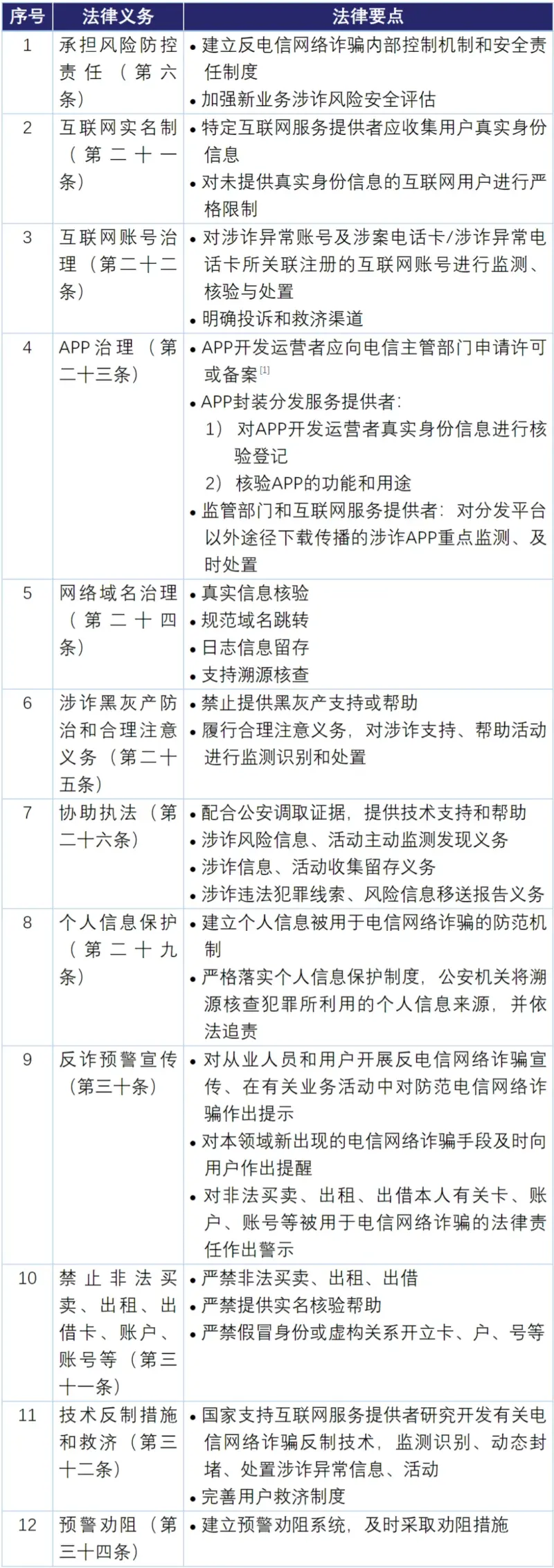 基于实践中互联网领域诈骗的类型与特点,《反诈法》针对性地建立互联网反诈义务体系,从事前防范、事中监测和事后处置等维度,压实互联网服务提供者主体责任。在《反诈法》下,互联网服务提供者主要法律义务及其要点列举如下: