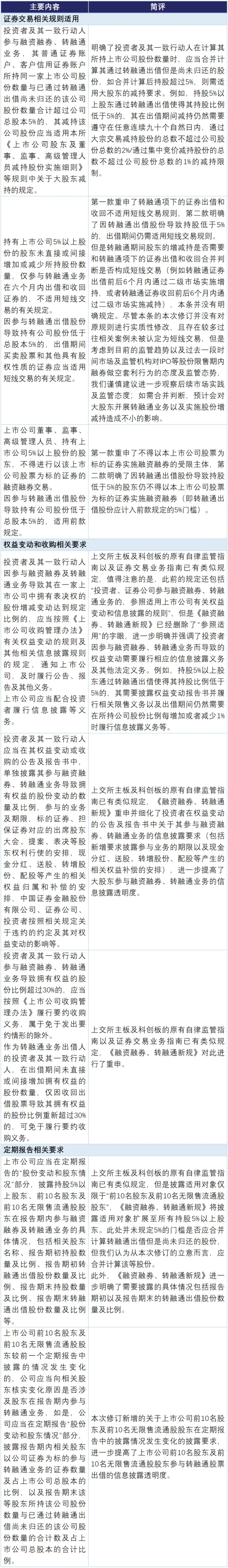1、明确了上市公司持股5%以上的股东,因参与转融通出借股份而导致其所持上市公司股份低于上市公司总股本5%的,出借期间仍需按照合并计算转融通出借股份后的持股比例适用相应规则,即不得违规减持、不得短线交易、不得进行以该上市公司股票为标的证券的融资融券交易。