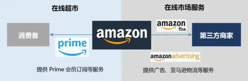 消费者通过网页或亚马逊应用程序访问亚马逊“在线超市”,消费者可以同时看到亚马逊直接零售的商品和第三方商家在亚马逊在线市场上销售的商品。