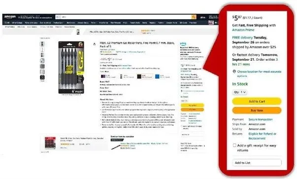 消费者可以在亚马逊在线超市上搜索其想要购买的商品,亚马逊会相应为消费者生成“搜索结果界面”,消费者可以进一步选择其中的某个商品查看详细信息。进入到“详细信息页面”后,通常可以看到“黄金购物车”,其中会展示该商品的某一个报价信息(同一商品可能会有多个商家销售,亚马逊会通过其算法选择一个商家的商品作为“推荐商品”(Featured Offer)在“黄金购物车”中展示报价信息),消费者可以通过“黄金购物车”将该商品加入购物车或选择直接购买。亚马逊平台上销售的产品中98%是通过“黄金购物车”中的加入购物车或直接购买功能完成的,因此赢得“黄金购物车”的位置对于商家而言非常重要。本案的起诉书中引用了如下图示,红框内即为亚马逊的“黄金购物车”。