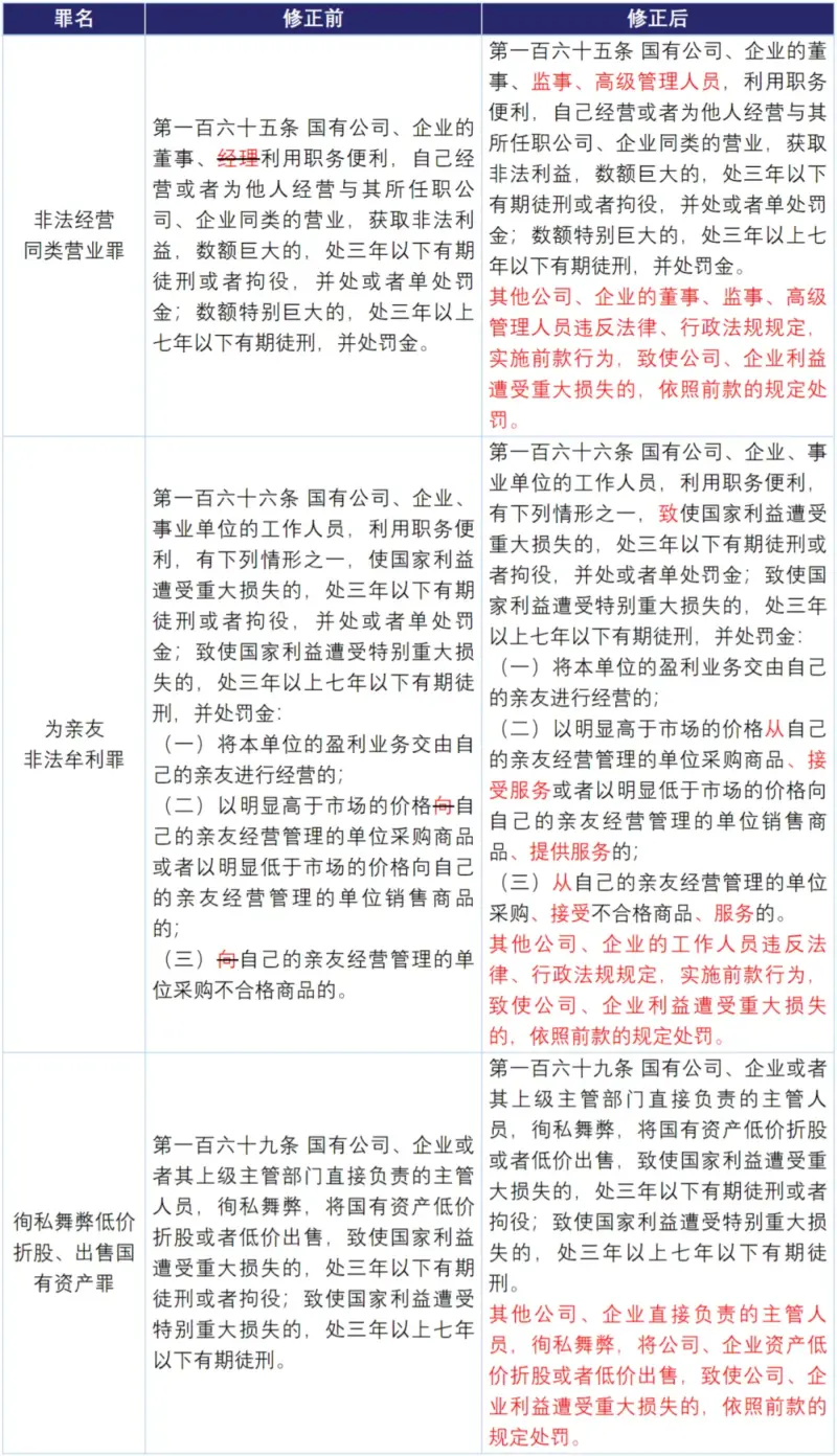 修正案将实践中频发的民企内部人员非法经营同类营业、为亲友非法牟利和徇私舞弊低价折股、出售资产三类“损公肥私”的背信行为[2]规定为犯罪,这是相关罪名自1997年《刑法》颁布以来的第一次修正。