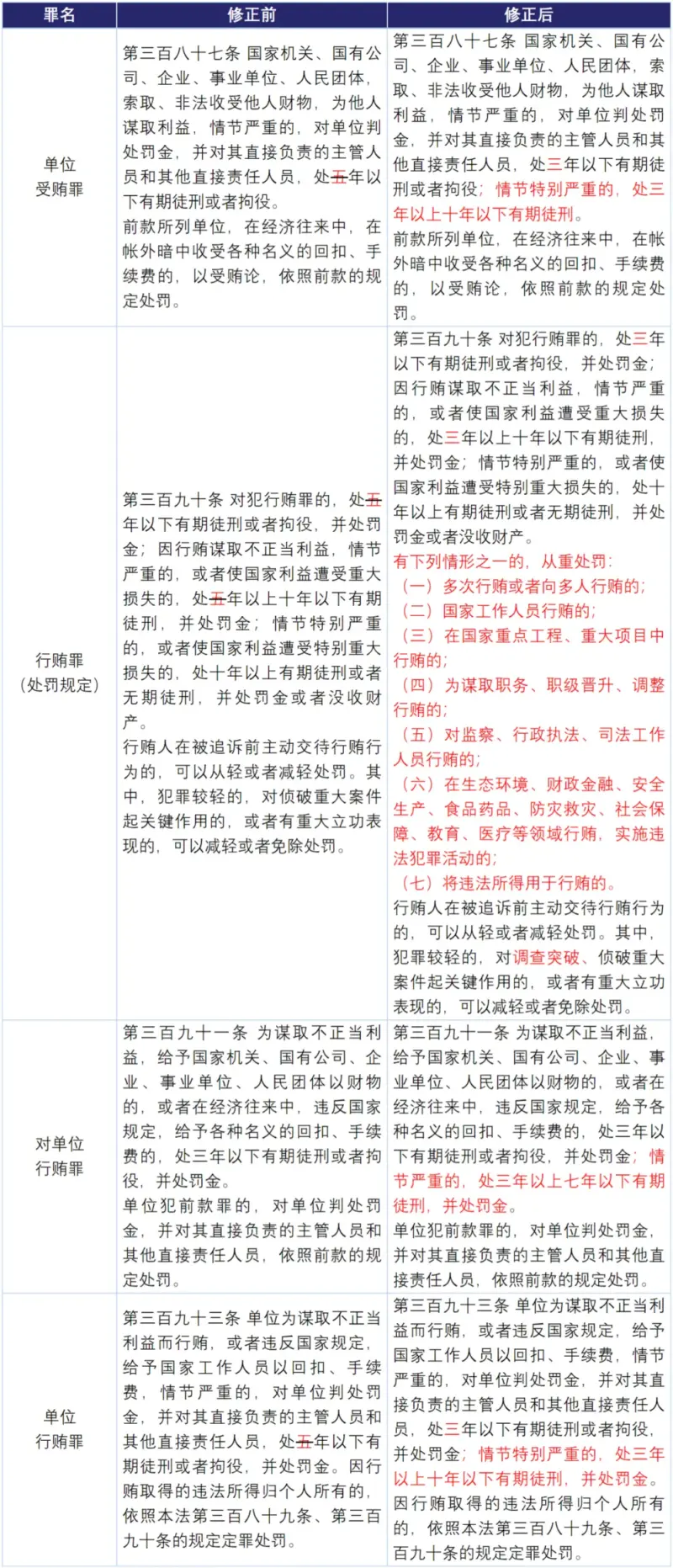 修正案加大了对单位行贿罪、单位受贿罪的处罚力度。将两个罪名从原本的一档刑罚调整为两档刑罚,并将单位受贿罪的最高刑由原先的五年有期徒刑提升至十年有期徒刑,将对单位行贿罪的最高刑由原先的三年有期徒刑提升至七年有期徒刑。修正案施行后,实践中单位部门收受回扣充实小金库的行为将受到更为严厉的惩处。