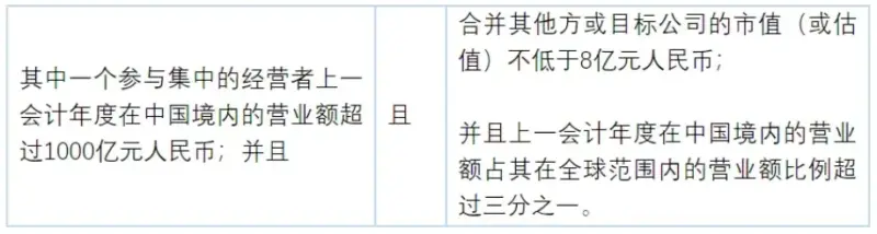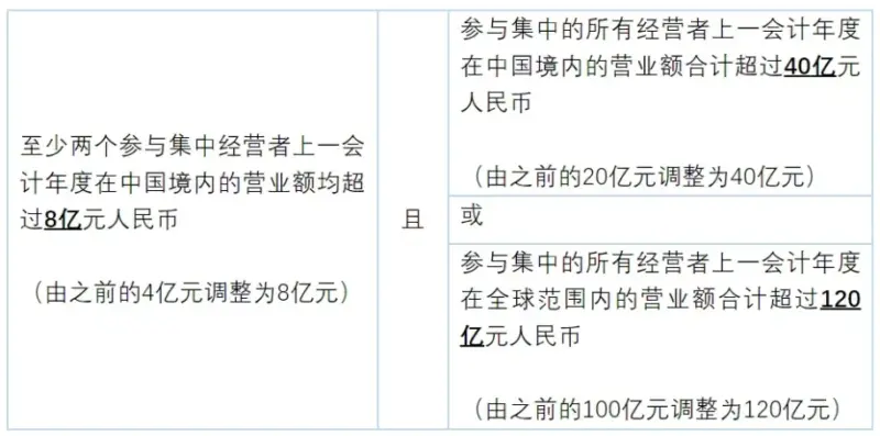 现行的经营者集中申报营业额标准于2008年开始适用,十多年来一直未曾改变。新《申报标准规定》大幅提高了参与集中经营者的营业额标准,尤其是参与集中经营者在中国境内的营业额标准。新营业额标准如下表所示:[1]