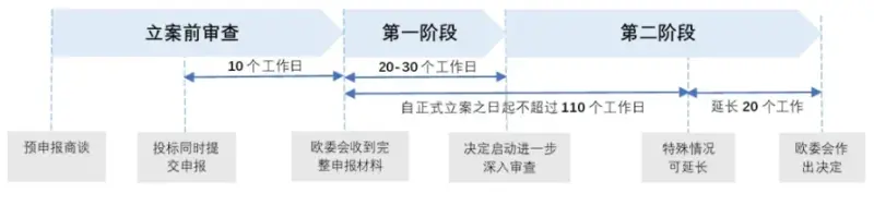 对于公共采购程序,欧委会将在收到完整申报材料后的20个工作日内完成初步审查,或对可能存在扭曲效果的项目启动深入调查。欧委会可在收到完整申报材料起的110个工作日内作出最终决定。