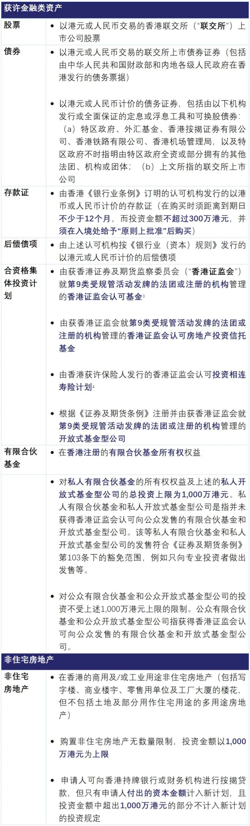 • 申请人须在投资期限内对下文所载获许金融类资产、非住宅房地产及资本投资者入境计划投资组合(统称“获许投资资产”)进行不少于3,000万港元(或等值外币)净值的投资。具体而言: