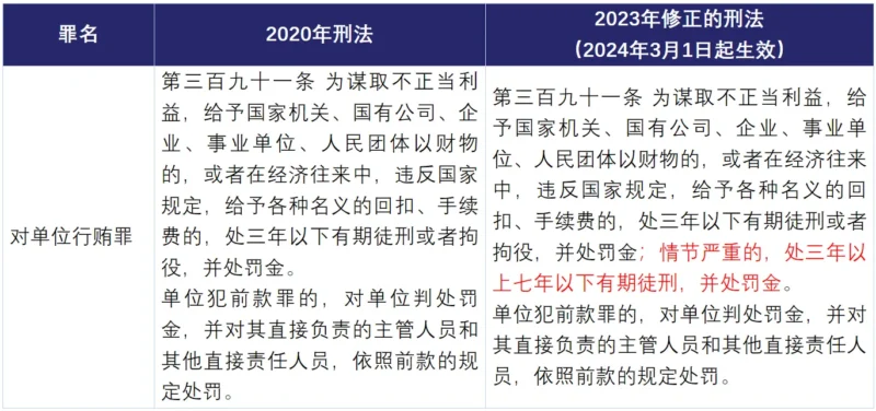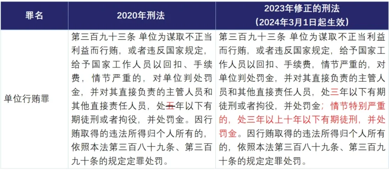 修正案加大了对单位行贿罪的处罚力度,将该罪名下的一档刑罚调整为两档刑罚,并提高了原法定最高刑。此次修订: