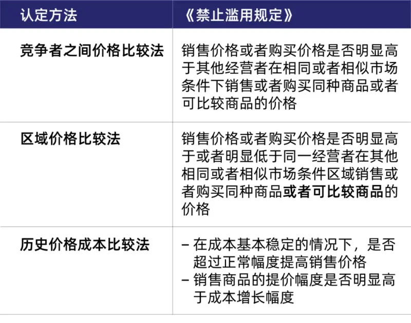 对于“不公平价格”的判断因素之一的区域价格法,如下表所示,《禁止滥用规定》明确了区域价格比较法的基准应为“同种商品或者可比较商品”,与竞争者之间价格比较法的基准保持了一致。考虑到区域价格比较法相对于其他认定方法而言在过往的案例中的应用似乎较少,这可能是结合执法实践对区域价格比较法在实际应用中遇到的常见问题而做出的进一步的完善,也体现了认定不公平价格构成滥用行为的谨慎态度。