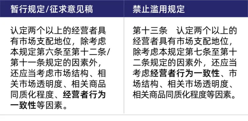 此次《禁止滥用规定》也进一步完善了“共同市场支配地位”的认定逻辑,将“经营者行为一致性”作为认定两个以上经营者具有市场支配地位的首要条件(与《暂行规定》和《征求意见稿》相比,调整了“经营者行为一致性”在考虑因素中的排序)。