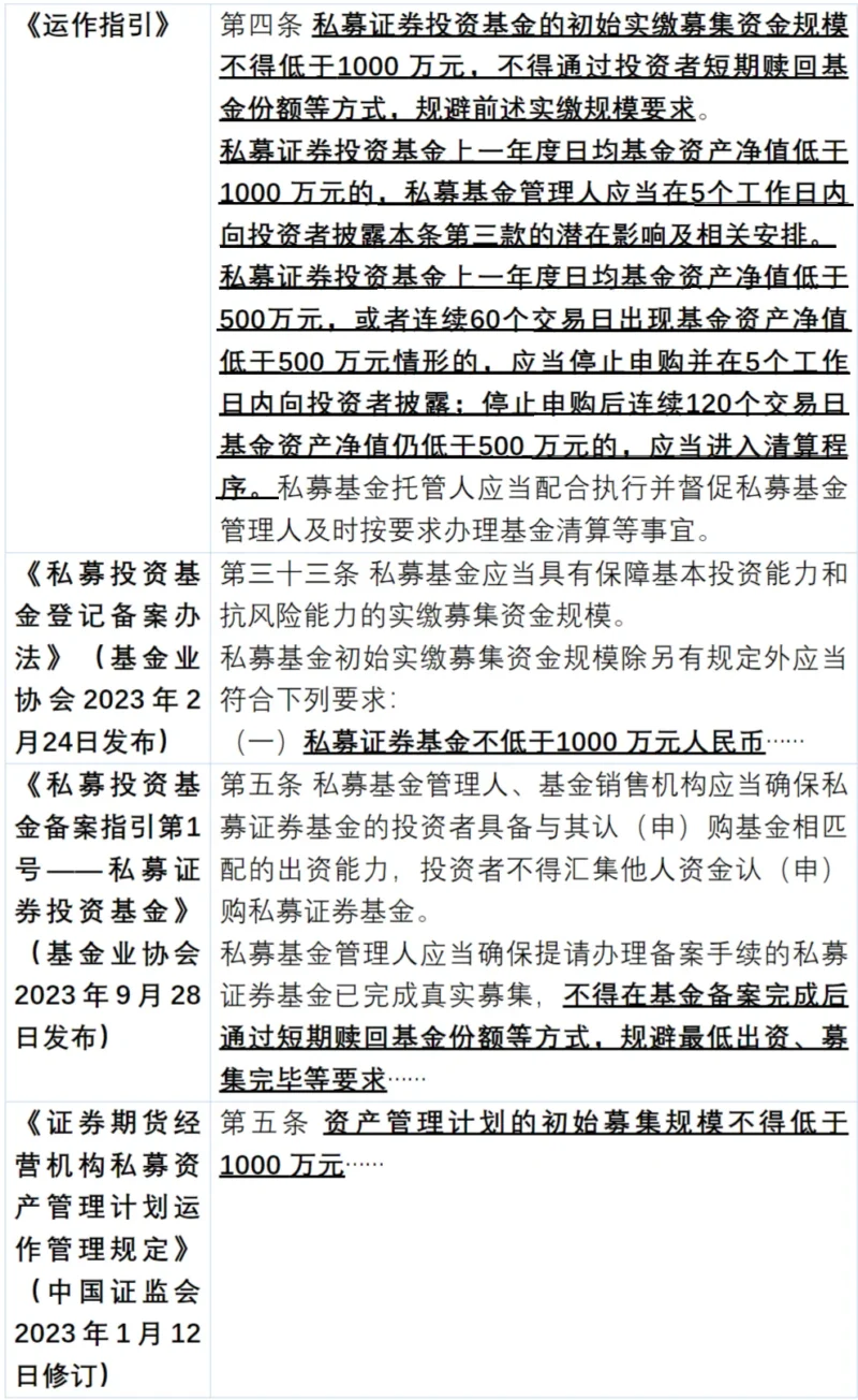 《运作指引》第四条重申了初始实缴募集资金规模不得低于1000万元和不得通过投资者短期赎回基金份额等方式规避实缴规模要求的规定。如上方表格所示,(部分)类似规定此前可见于《证券期货经营机构私募资产管理计划运作管理规定》《私募投资基金登记备案办法》《私募投资基金备案指引第1号——私募证券投资基金》等文件。
