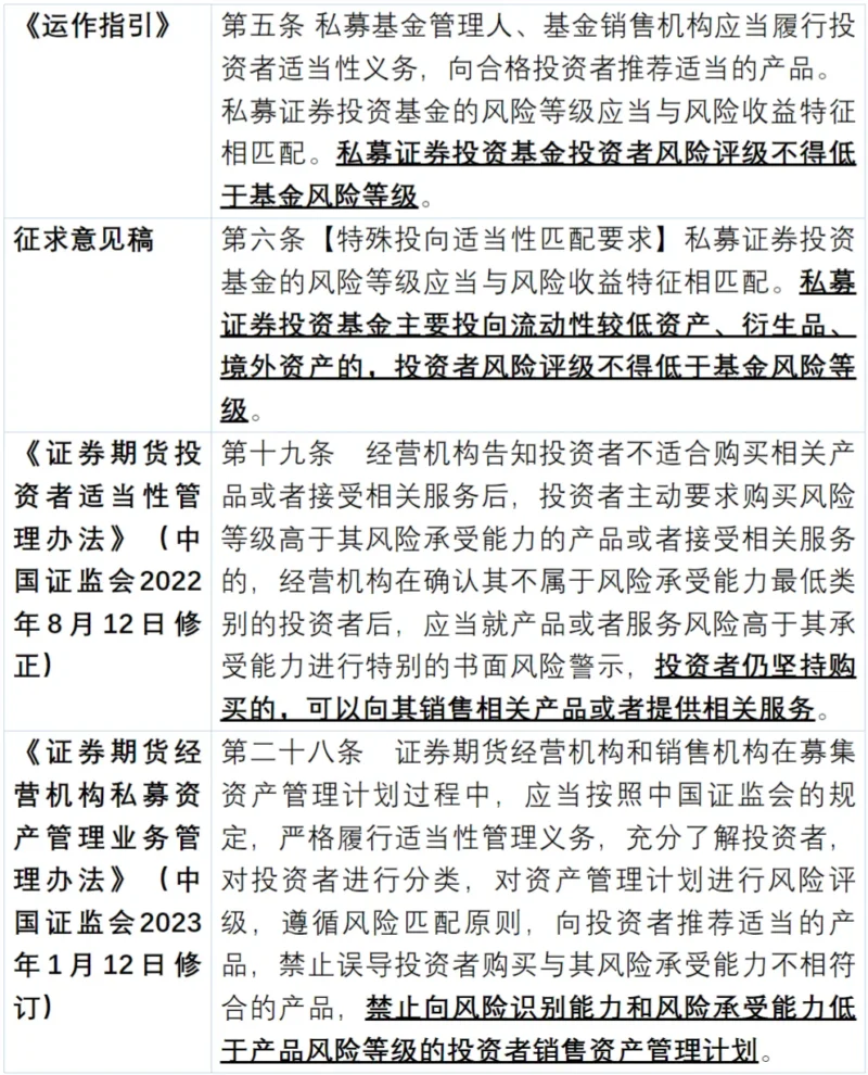 关于本次《运作指引》,征求意见稿规定“私募证券投资基金主要投向流动性较低资产、衍生品、境外资产的,投资者风险评级不得低于基金风险等级”,并未禁止前述情形之外的错配。我们理解,可能是考虑到私募证券基金与私募资管计划的产品特性类似,此次基金业协会在《运作指引》正式稿中禁止私募基金销售错配,与私募资管计划的监管要求拉平。