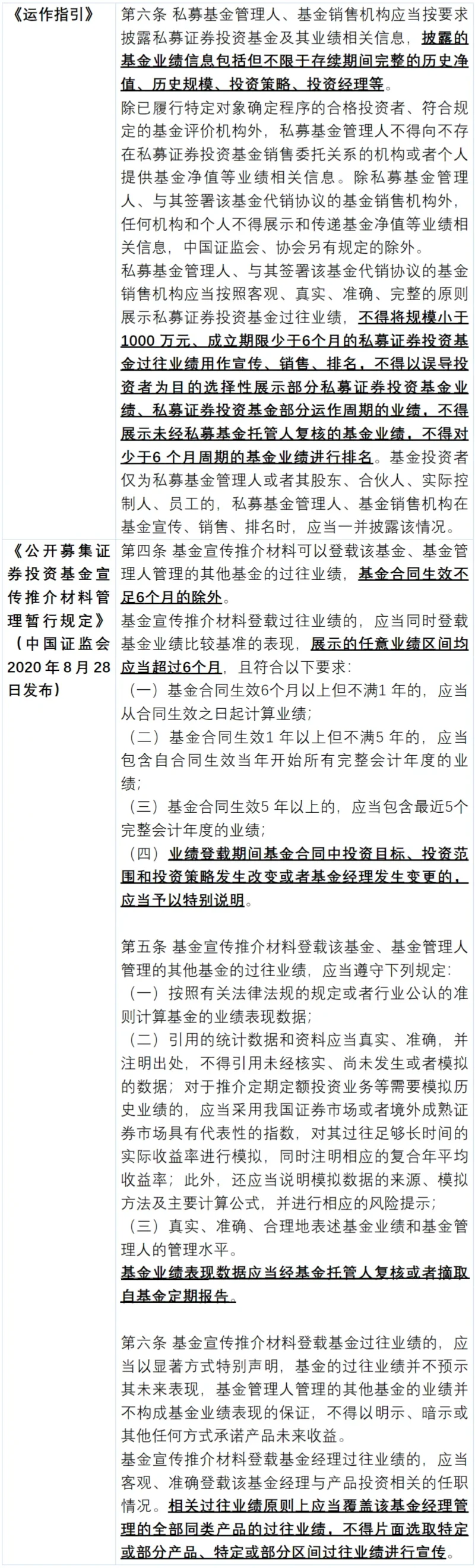 相比征求意见稿,《运作指引》新增了关于私募证券基金业绩宣传的相关要求,与公募基金宣传推介的部分要求对比如下:
