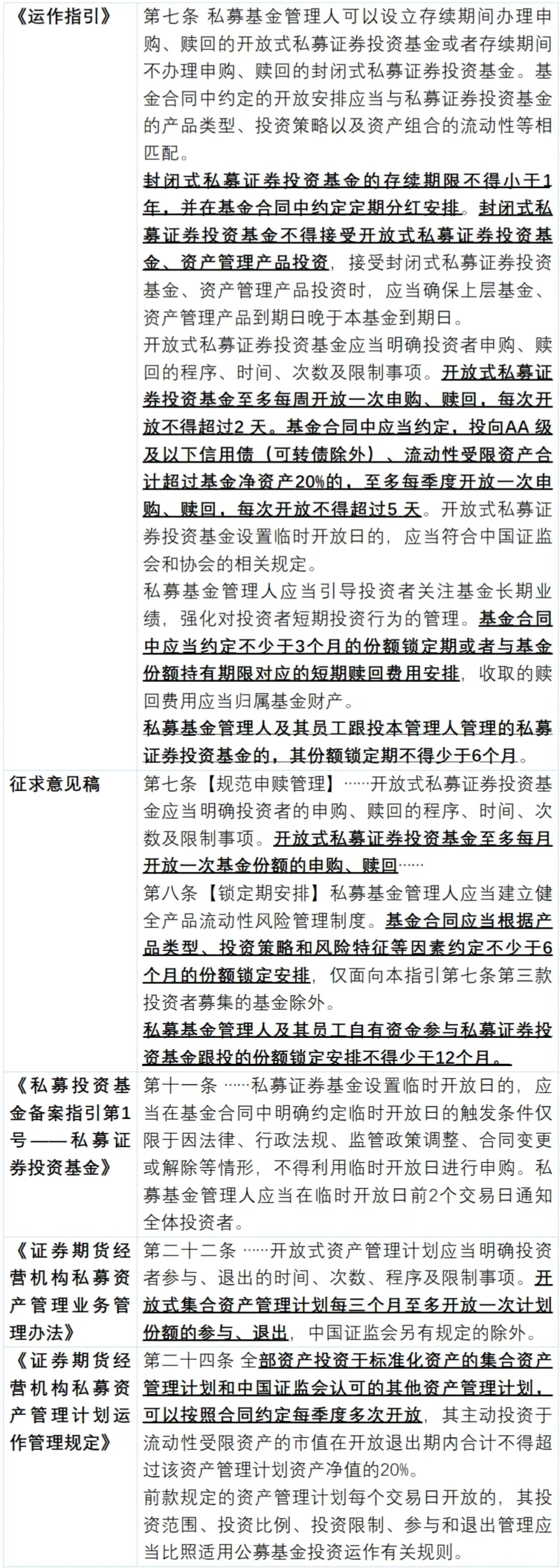 • 征求意见稿提出开放式私募证券基金至多每月开放一次,并设置不少于6个月的份额锁定安排,《运作指引》正式稿分别放宽为至多每周开放一次(每次开放不得超过2 天)和3个月的锁定期,同时允许私募证券基金通过设置短期赎回费的方式替代强制锁定期安排,允许市场保留适当的选择权;