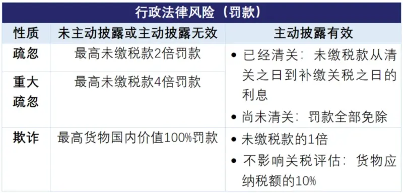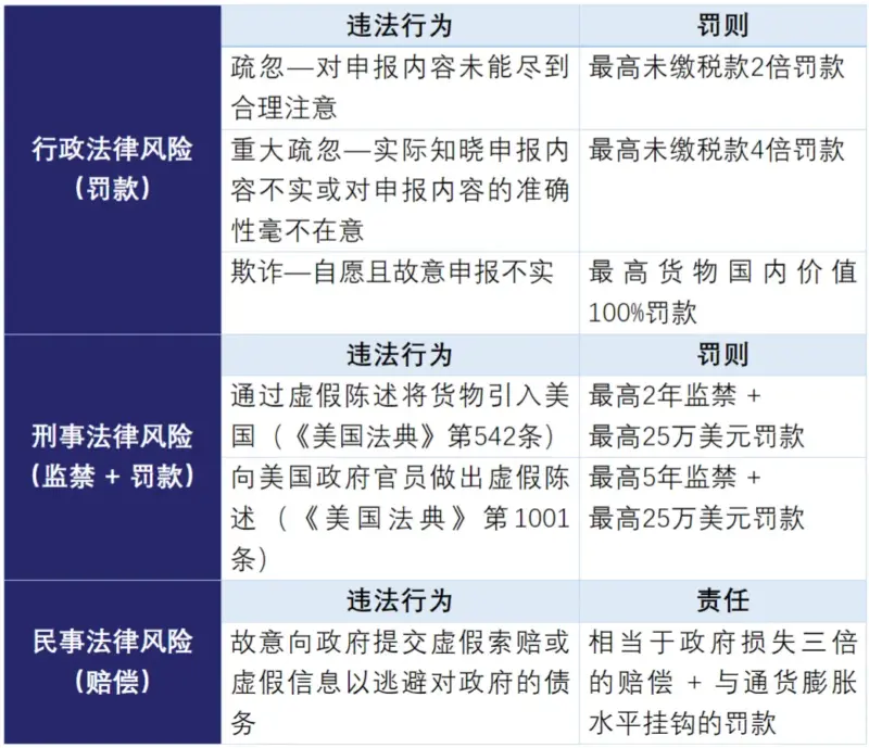 基于前文介绍,我们将企业在进口申报环节因向美国海关申报不实而可能面临的法律风险总结如下: