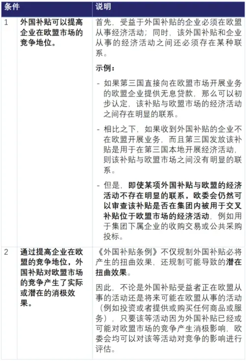 - 即使某项外国补贴与欧盟市场内的经济活动没有直接联系,欧委会仍然可以审查该补贴是否被用于交叉补贴了在欧盟的并购交易和公共采购项目。