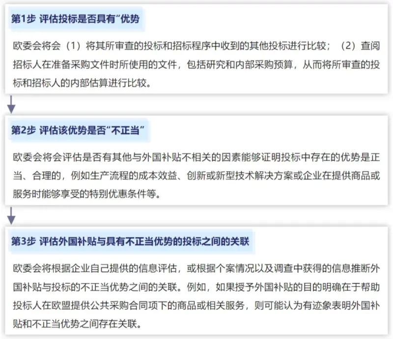 就公共采购项目的审查而言,工作文件明确,欧委会仅会就当下的公共采购项目本身评估外国补贴是否存在扭曲效果(包括评估投标是否具有不正当优势)。