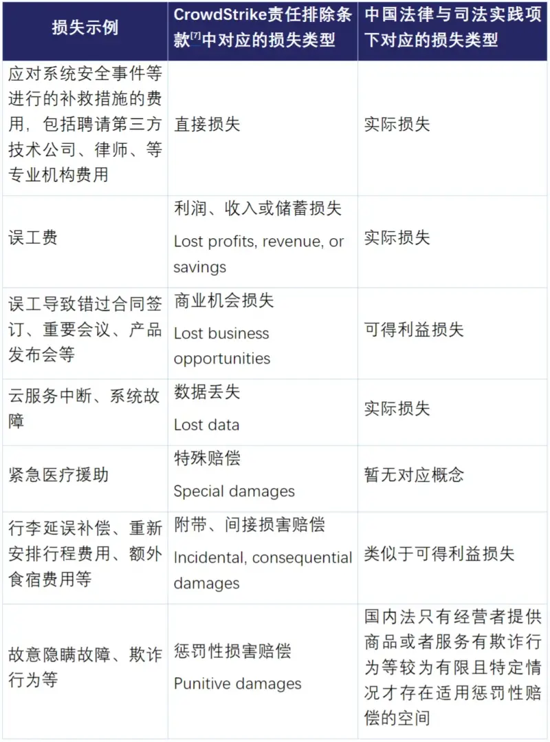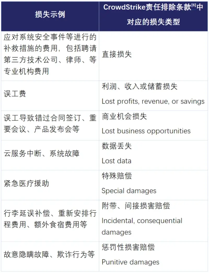 尽管现实中CrowdStrike事件造成的损失是多种多样的,我们针对这些损失的类型以及CrowdStrike服务条款中涉及的损失类型和排除罗列如下。