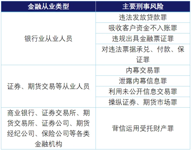 根据《刑法》,不同金融从业人员在经营阶段涉业务违规、证券违法犯罪的刑事风险对应如下: