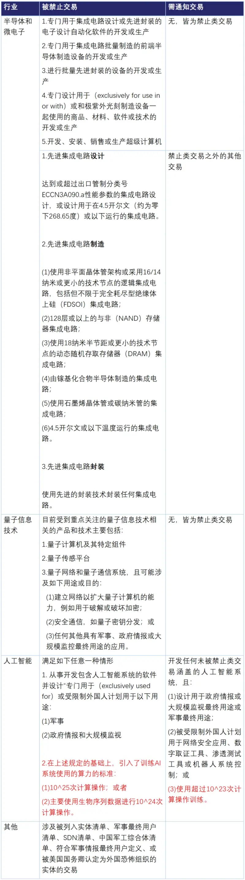 最终规则在被禁止交易和需通知交易下,均新增了两项内容基本一致的说明,澄清了人工智能领域受限制的主体范围: