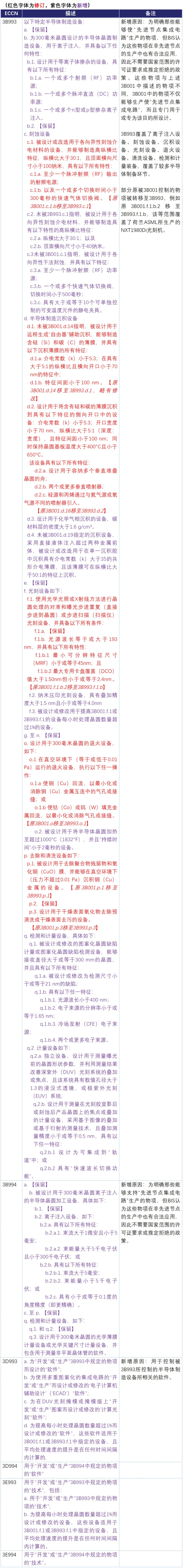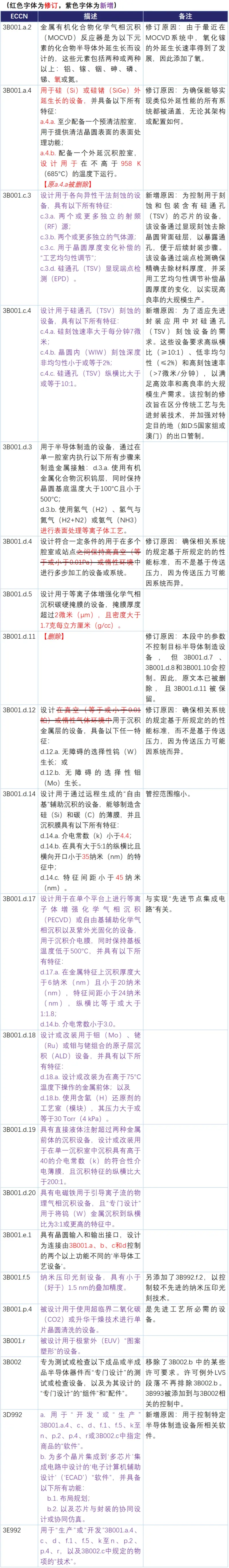 1202规则修订并新增了3B001、3B002相关物项及对应的3D992软件和3E992技术,该等物项基于NS和RS原因受到管控,因而在出口至中国及D:5国家时存在许可证要求。在本次修订后,该等物项被BIS认为系专门设计用于支持先进节点集成电路制造相关活动,因而被施加了面向中国及D:5国家的国家层面的限制。相关物项ECCN修订/新增情况及对应的修订/新增原因分析如下: