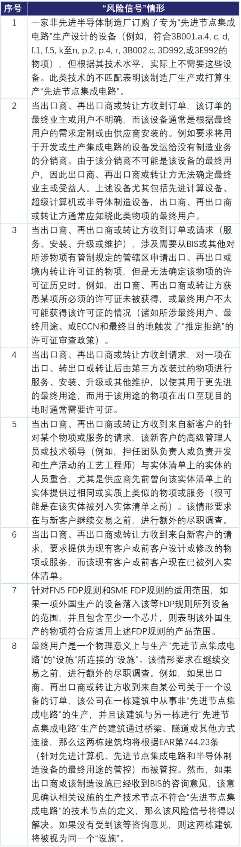 在1202规则中,BIS在EAR第732补编3“了解你的客户”指南及风险信号部分新增了8条“风险信号”(Red flags)场景,主要指向可能存在违规获取受控半导体制造设备风险的情景,并要求出口商在发现这些情形时开展进一步尽职调查以排除风险。八项“风险信号”的详细内容请见下方表格: