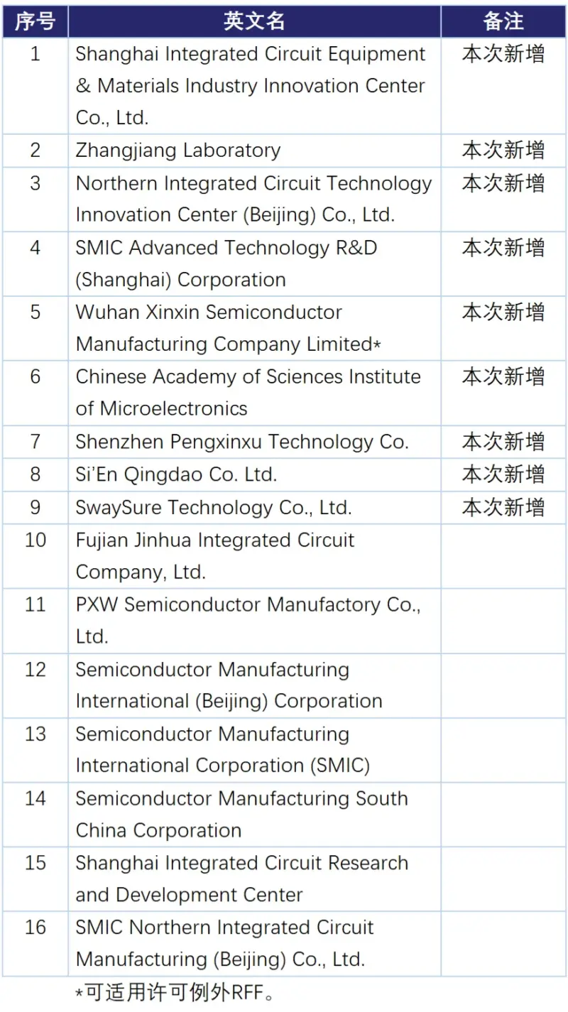 本次被识别为实体清单脚注5的主体包括16家中国半导体制造厂,其中9家企业系本次新增被列,7家企业系由原一般实体清单“升级”为脚注5实体。BIS表示,其将会持续评估并及时新增脚注5名单,我们理解不排除未来会有更多中国代工厂被列为脚注5实体。BIS同时也强调对中国厂商先进节点集成电路制造能力的尽调义务并未被免除。目前的脚注5主体名单请参见下方表格: