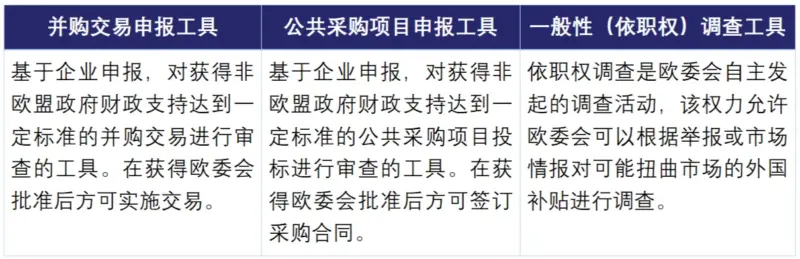 《外国补贴条例》于2023年7月12日生效,旨在规范在并购交易、公共采购项目以及其他市场情况下可能扭曲欧盟市场的外国补贴。下表1列出了欧委会在《外国补贴条例》项下的三种执法工具。商务部认为欧委会通过下述三种工具对于中国企业进行的执法存在诸多问题。
