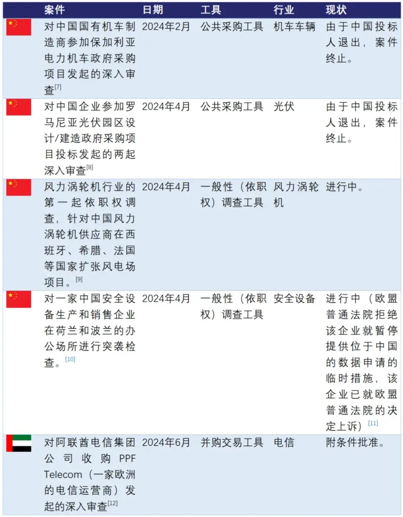 自《外国补贴条例》于2023年底施行以来,欧委会几乎所有的深入审查和调查均涉及中国企业。在此期间,欧盟还发布了一份超过700页的报告,分析了国家干预对中国经济的扭曲,涉及多个行业,欧委会可能会将此份报告作为未来调查的蓝本[5]。同期,欧委会还根据其他监管工具(包括欧盟的反补贴规则[6]和《国际采购工具》)启动了其他调查。