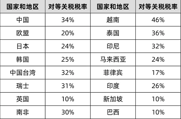 2025年4月2日(美国东部时间),基于《1977年国际紧急经济权力法》(IEEPA)授权,美国总统特朗普签署《行政令》[1],宣布对大多数国家(地区)/贸易伙伴实施对等关税。对等关税包括10%的基准税率以及对数十个贸易伙伴的更高税率,其中对华对等关税为34%。有评论认为,这项近百年来对全球经贸格局冲击最强烈、覆盖面最广泛的关税举措,料将重塑美国和全球经济,推高通胀并拖累经济增长。[2]