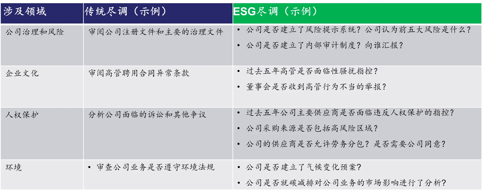 全面尽调法:对于ESG风险的全面尽调
