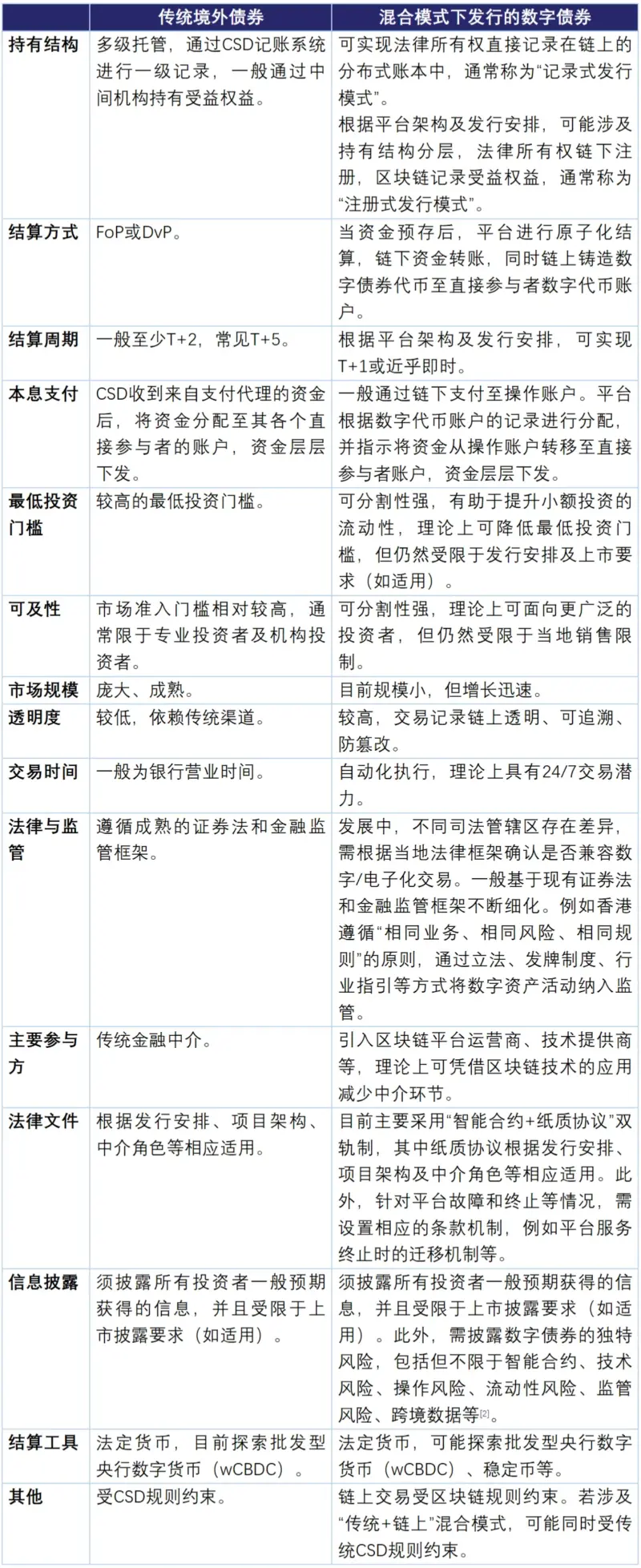 为适应不同发行人需求和监管要求,数字债券发行架构呈现多元化发展,包括公有链、许可链及混合模式等。香港主流的CMU主导、DLT延伸的混合模式,既保留了传统债券发行特性,又通过区块链提升了透明度与自动化水平。这种创新与保守的平衡,恰恰反映了当前数字债券发展既要突破技术边界,又需应对法律确定性的双重挑战。随着香港计划将代币化债券发行常规化,探索多币种期限结构,数字债券正推动资本市场进入一个效率与合规并重的新时代。对于区块链与传统金融基础设施的混合模式,在实务操作中,其通常保留传统境外债券发行的主要特性,使投资者能够沿用其既有的投资操作习惯。区块链的引入亦带来了一些值得关注的差异1