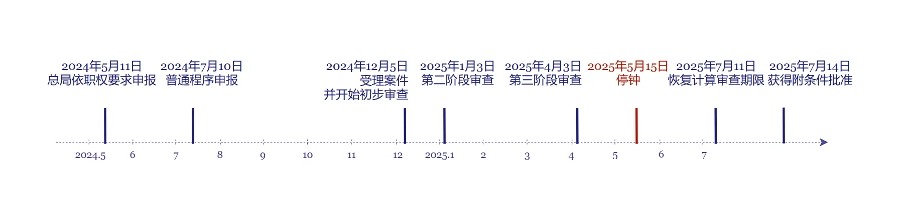 该交易是我国反垄断执法史上首例在未达到申报标准的情况下,由市监总局依职权主动要求申报并附条件批准的案件。同时,该案也是《反垄断法》2022年修正案明确赋予执法机构“主动审查权”后,该权力在实践中具有代表性的一次适用。根据总局发布的审查决定书,该交易于2024年7月10日以普通程序提交申报,最终于2025年7月14日获批,审查历时369日(含停钟57日)。长达一年的审查周期不仅体现出监管机构对该类交易可能带来竞争影响的高度重视,也反映出其对虽未达申报门槛但具有行业敏感性或潜在实质竞争影响交易所持的审慎态度。