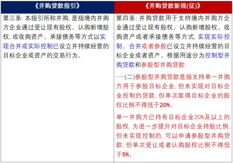 《并购贷款新规(征)》就“控制型并购贷款”和“参股型并购贷款”业务的开展设置了差异化的监管要求。