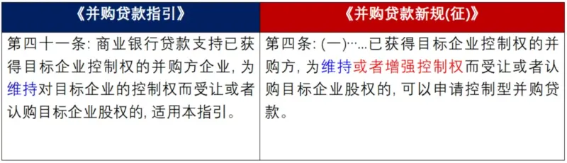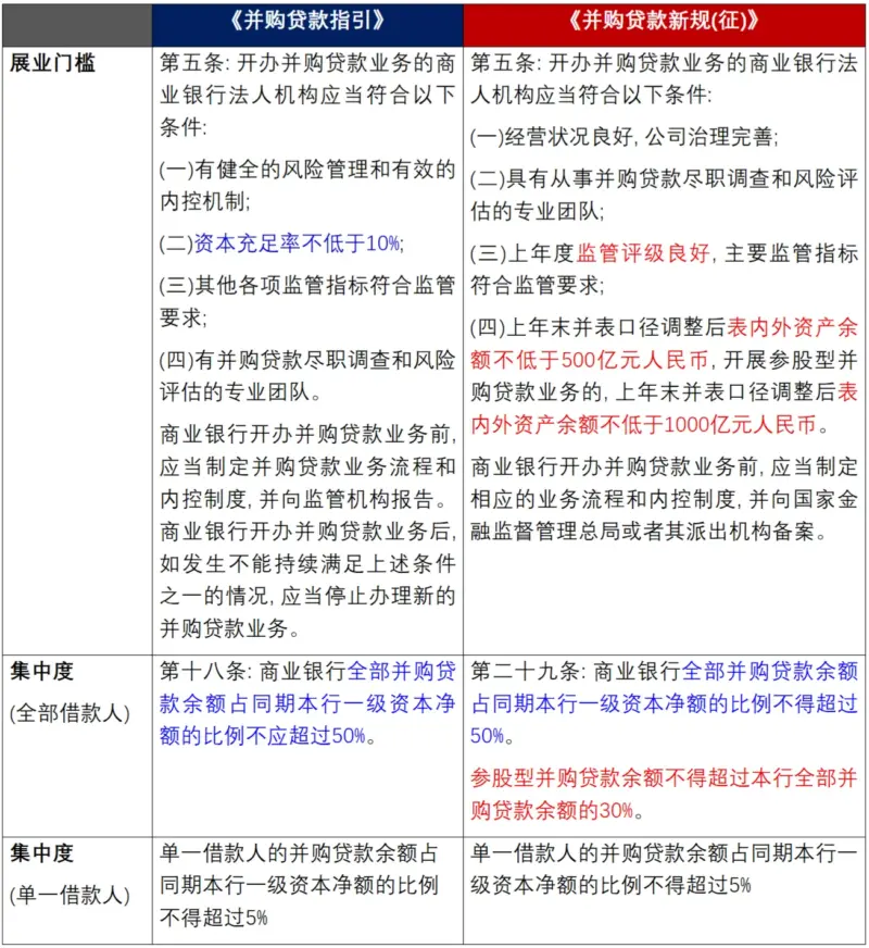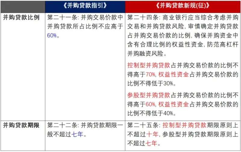 我们将《并购贷款新规(征)》相对于《并购贷款指引》在贷款比例和期限方面的变化, 简要列示如下, 以供参考。