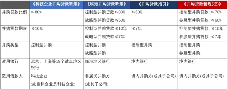 我们观察到, 在本次《并购贷款新规(征)》发布前, 中国人民银行、金管总局等部门曾出台一些并购贷款领域的试点政策, 积极支持在试点地区开展试点并购贷款业务。例如, 中国人民银行、金管总局等部门联合于2025年5月13日发布了《加快构建科技金融体制有力支撑高水平科技自立自强的若干政策举措》(“《科技企业并购贷款政策》”),提出选择在部分商业银行和试点城市开展科技企业并购贷款试点,将贷款占并购交易价款比例提高到80%,贷款期限延长到10年; 金管总局上海分局于2024年9月24日印发了《在临港新片区审慎放宽非居民并购贷款限制试点工作方案》(“《临港并购贷款政策》”),允许符合条件的在临港新片区设立分支机构并通过其展业的银行(“临港地区银行”)开展非居民并购贷款业务试点,将贷款占并购交易价款比例提高到80%,贷款期限延长到10年,并规定并购贷款可支持符合下列条件的未能实现合并或实际控制目标企业的“收购目标企业部分股权的战略性股权交易行为”(“战略型并购”): (1)基于横向并购或纵向并购战略意图,并购方与目标企业有产业相关性;(2)并购方应对目标企业具有重大影响,或可与其他方共同控制目标企业;(3)原则上收购目标企业股权比例累计不少于20%。我们将该等试点政策的核心监管要求和适用场景, 及其与现行的《并购贷款指引》和《并购贷款新规(征)》的差异, 简要梳理如下, 以供对比参考。